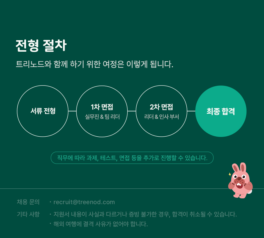 - 서류 합격 이후부터는 단계마다 합격, 불합격 모두 안내합니다.